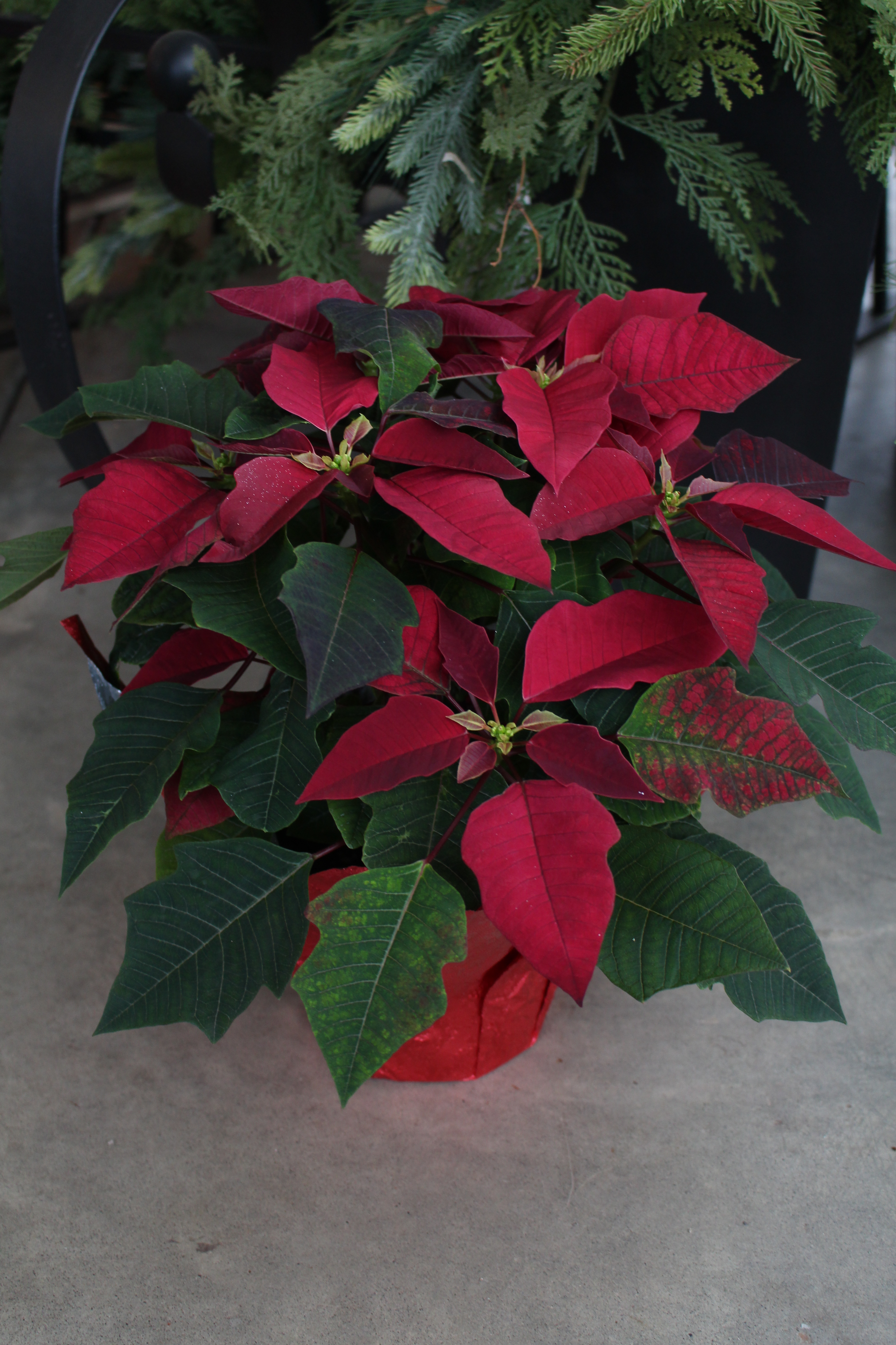 ‘Burgundy’ Poinsettia, single with red foil grown at Creekside Home & Garden.