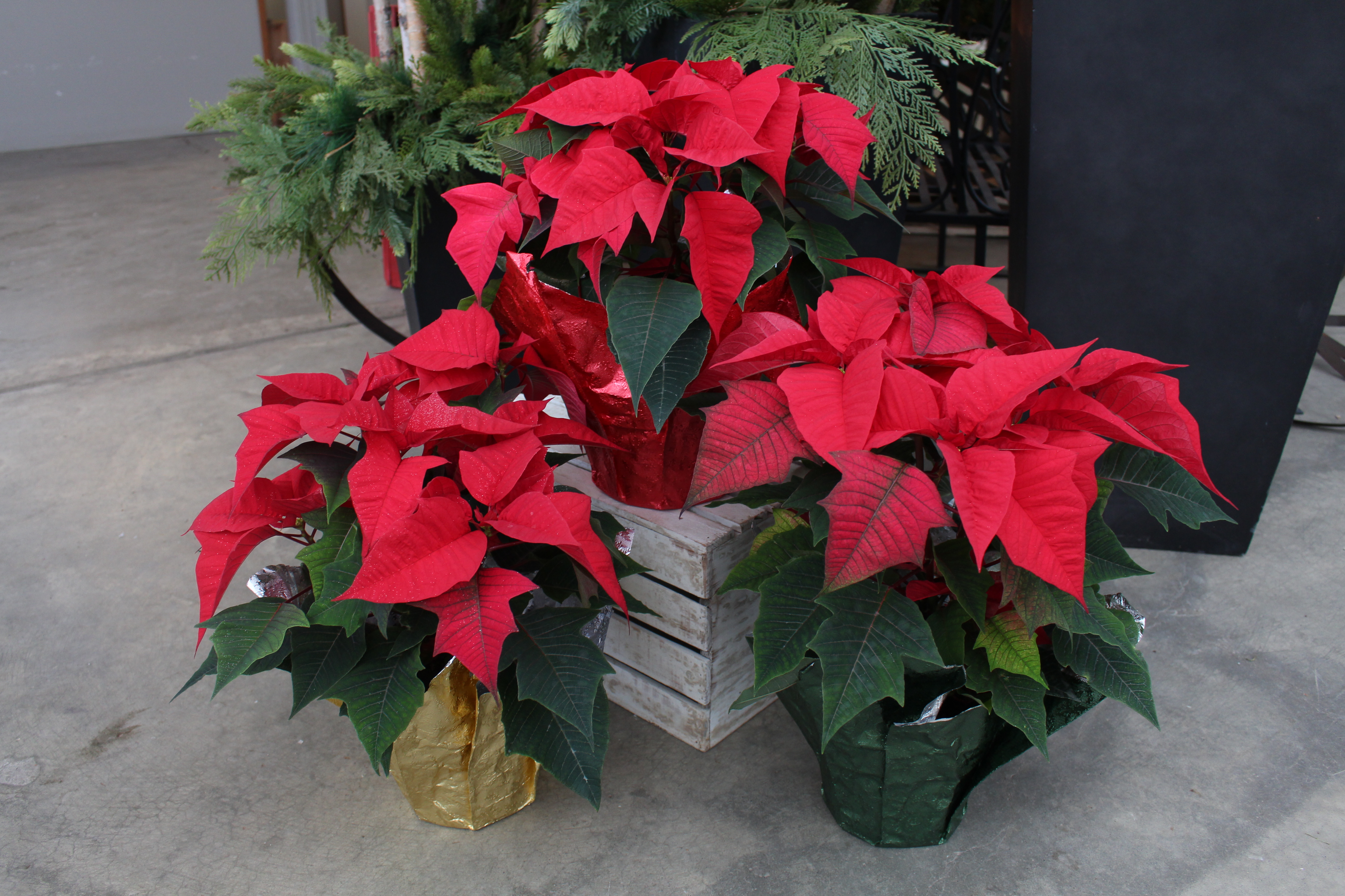 Single poinsettias in green, gold and red foil at Creekside Home & Garden Single Poinsettias in Foil.